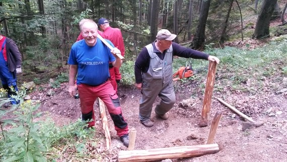 Zdravko (načelnik markacistov PD Kamnik) je soliral na verižni motorni žagi, Rajko - Bibita (načelnik markacistov PD Bajtar Velika planina) pa se je izkazal pri montaži bočnih zaščit in stopnic - tudi »kitajski« žeblji so šli v premalo zavrtano luknjo. Boštjan (PD Kamnik) je upravljal z vrtalnikom in udarnim kladivom ter pomagal pri montaži bočnih zaščit in stopnic, Jože (PD Domžale) pa se je posvečal zemeljskim delom ter podpori monterjev. Jaz, kot vodja akcije, sicer član PD Domžale, sem od vseh naštetih specialnosti, ki so bile potrebne za izvedbo celote, verjetno požel največ odobravanja, ko sem na delovišče dostavil malice.