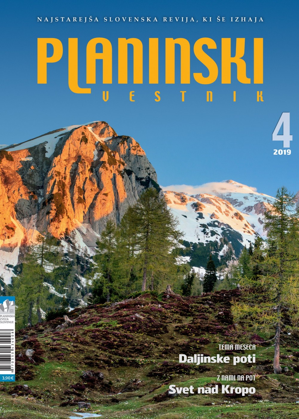 | Preberite si intervjuja s Hansjörgom Auerjem, avstrijskim alpinistom, učiteljem športa in matematike, in pisateljem, ki je letos obiskal 13. festival gorniškega filma v Ljubljani. V krajšem pogovoru predstavljamo tudi Živo Tavčar, ki je bila lani ena izmed udeležencev pohoda po 620 kilometrov dolgi alpski transverzali od Ženevskega jezera do obale Sredozemskega morja, kjer je izbrano skupino vsak dan spremljala filmska ekipa kot v resničnostnem šovu. V rubriki Z nami na pot vas vabimo v svet nad Kropo, na Vodiško planino. Nanjo se lahko povzpnemo z različnih strani - in te tudi opisujemo v tokratni sredici. Podajamo se še na števine potepe in plezanja, med njimi v Furlanske Dolomite, z gorskim kolesom pa smo prečili Skalno gorovje. Pišemo o tekmovanju Mladina in gore, ki je letos praznovalo trideset let, o doživetju zimskega vzpona na Triglav in turnega smučanja s Kanjavca. V vzgoji smo se lotili treninga športnega plezanja - tudi za rekreativce, pri zdravju pa predstavljamo športna očala z dioptrijo. Ne spreglejte Planinčkovega kotička s frfotavim gospodom netopirjem, debate z okrogle mize o klinih in svedrovcih ter o dveh naših zavarovanih cvetlicah, ki pospešeno izginjata. Sledijo stalne rubrike: literatura, novice iz vertikale, športnoplezalne novice, planinska organizacija, novice, v spomin. Želimo vam prijetno branje Planinskega vestnika, ki je izšel 12. aprila. Poiščite ga v svojem kiosku ali v spletni trgovini PZS, naročniki pa kar doma v svojih nabiralnikih. Srečno in varen korak na vseh vaših poteh!