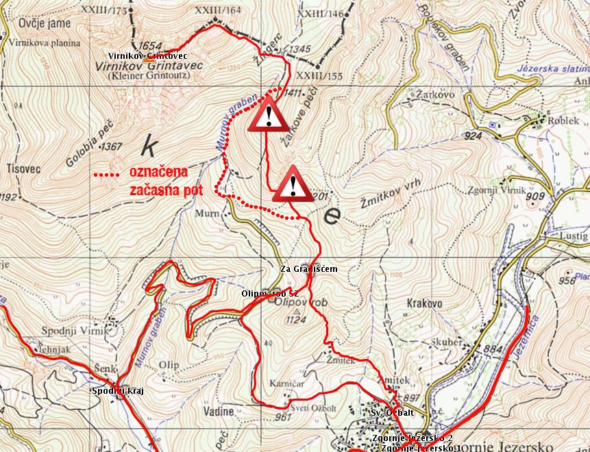 četrtek, 4. julij 2019 ob 10:00, ogledov: 7590 Planinske pot Zgornje Jezersko–Virnikov Grintovec ponovno v celoti odprtaPlaninsko društvo Jezersko | | | Objavil(a): Matej Ogorevc | | Planinska zveza Slovenije in Planinsko društvo Jezersko obveščata, je odsek planinske poti Zgornje Jezersko (897 m)–Virnikov Grintovec (1654 m) ponovno odprt in varno prehoden | PRVOTNO BESEDILO: V skladu s 16. členom Zakona o planinskih poteh (Uradni list RS, št. 61/2007) Planinska zveza Slovenije in Planinsko društvo Jezersko obveščata, da bo do nadaljnjega ZAPRT odsek planinske poti Zgornje Jezersko (897 m)-Virnikov Grintovec (1654 m) zaradi gozdarskih del. Planince prosimo, da dosledno upoštevajo zaporo planinske poti in se nanjo ne podajajo. Hvala za razumevanje. Obhod je začasno označen mimo kmetije Murn. |