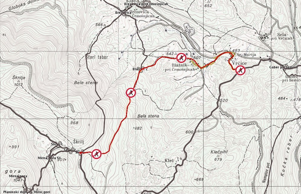 - iz Brezovice pri Črmošnjicah čez Stari tabor oz. Bele stene;