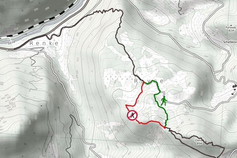 Prvotno obvestilo: Planinsko društvo Litija sporoča, da je zaradi podrtega drevja neprehodna in do nadaljnjega ZAPRTA planinska pot Renke-Ostrež in sicer v delu od vasi Ravne do razcepa poti pod Ostrežem (na sliki označeno z rdečo). Obhod je urejen in označen (na sliki označen z zeleno).