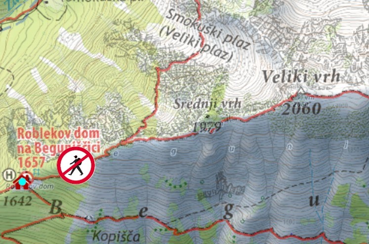 OPOZORILO: Uporabniki uporabljajo planinske poti na lastno odgovornost. Uporabniki planinskih poti morajo pri uporabi planinskih poti ravnati samoodgovorno in odgovorno do drugih tako, da ne ogrožajo ali poškoduje sebe ali drugega. Uporabnik je dolžan planinsko pot uporabljati tako, da se po njej ter na in ob zemljišču, preko katerega poteka in na drugih nepremičninah ter favni in flori ob njej ne dela škoda. Prepovedano je omejevati dostop na planinske poti ter poškodovati, odstranjevati ali uničevati markacije, usmerjevalne table, skrinjice in varovalno opremo in druge oznake ali uporabljati neoznačene bližnjice. |