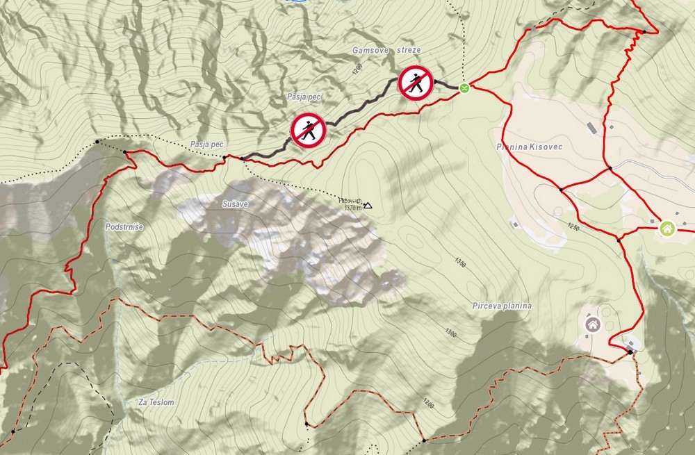 OPOZORILO: Uporabniki uporabljajo planinske poti na lastno odgovornost. Uporabniki planinskih poti morajo pri uporabi planinskih poti ravnati samoodgovorno in odgovorno do drugih tako, da ne ogrožajo ali poškoduje sebe ali drugega. Uporabnik je dolžan planinsko pot uporabljati tako, da se po njej ter na in ob zemljišču, preko katerega poteka in na drugih nepremičninah ter favni in flori ob njej ne dela škoda. Prepovedano je omejevati dostop na planinske poti ter poškodovati, odstranjevati ali uničevati markacije, usmerjevalne table, skrinjice in varovalno opremo in druge oznake ali uporabljati neoznačene bližnjice. |