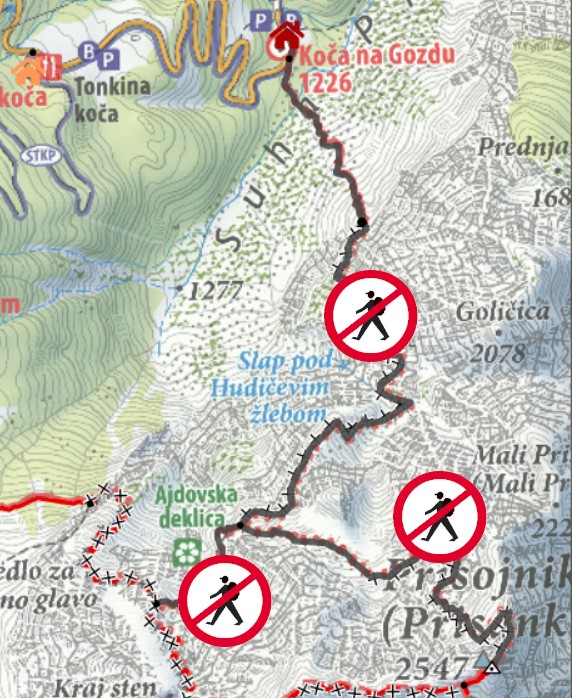 OPOZORILO: Uporabniki uporabljajo planinske poti na lastno odgovornost. Uporabniki planinskih poti morajo pri uporabi planinskih poti ravnati samoodgovorno in odgovorno do drugih tako, da ne ogrožajo ali poškoduje sebe ali drugega. Uporabnik je dolžan planinsko pot uporabljati tako, da se po njej ter na in ob zemljišču, preko katerega poteka in na drugih nepremičninah ter favni in flori ob njej ne dela škoda. Prepovedano je omejevati dostop na planinske poti ter poškodovati, odstranjevati ali uničevati markacije, usmerjevalne table, skrinjice in varovalno opremo in druge oznake ali uporabljati neoznačene bližnjice. |