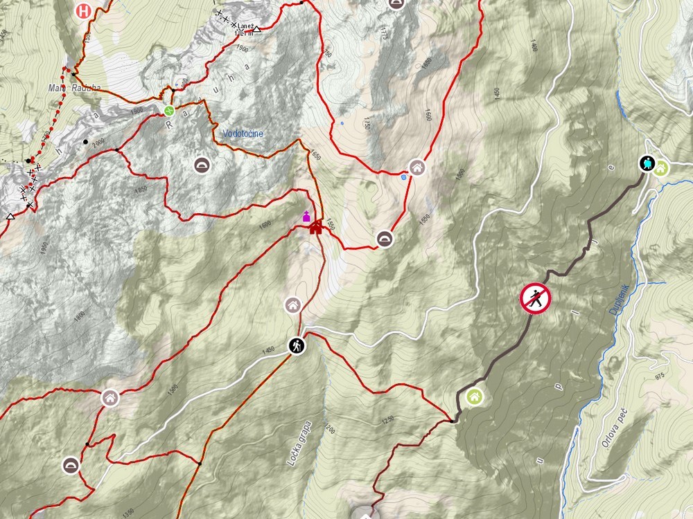 | OBVESTILO UPORABNIKOM PLANINSKIH POTI: Uporabnikom planinskih poti priporočamo, da se na spletni strani stanje-poti.pzs.si, v bližnji planinski koči ali pri lokalnem planinskem društvu predhodno informirajo o dejanskem stanju planinskih poti. Če opazite poškodbe planinskih poti ali njihovo neustrezno urejenost (obledele markacije, zaraščenost ipd.), prosimo, da na naslov poskodbe.poti@pzs.si pošljete sporočilo, v katerem navedite, na kateri planinski poti ste opazili pomanjkljivost in pomanjkljivost opišite ter če je možno, dodajte tudi fotografijo.