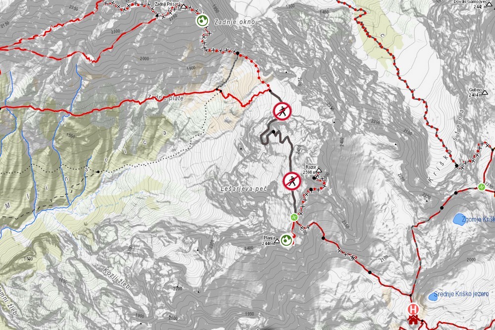 OBVESTILO UPORABNIKOM PLANINSKIH POTI: Uporabnikom planinskih poti priporočamo, da se na spletni strani stanje-poti.pzs.si, v bližnji planinski koči ali pri lokalnem planinskem društvu predhodno informirajo o dejanskem stanju planinskih poti. Če opazite poškodbe planinskih poti ali njihovo neustrezno urejenost (obledele markacije, zaraščenost ipd.), prosimo, da na naslov poskodbe.poti@pzs.si pošljete sporočilo, v katerem navedite, na kateri planinski poti ste opazili pomanjkljivost in pomanjkljivost opišite ter če je možno, dodajte tudi fotografijo.