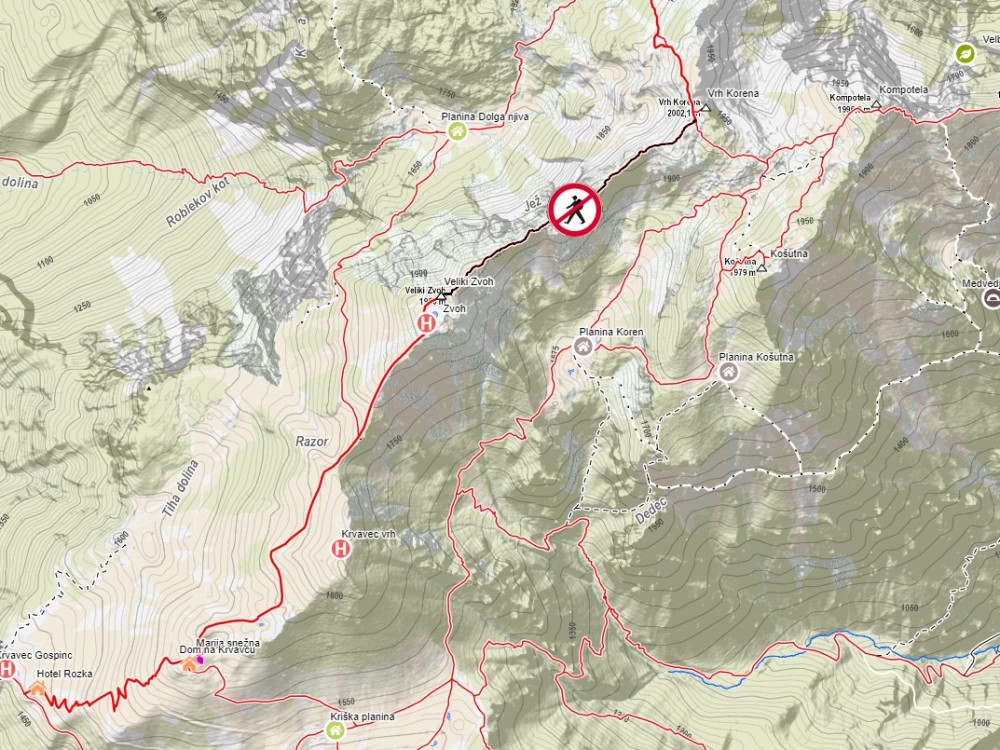 četrtek, 23. junij 2022 ob 14:30, ogledov: 1432 Delovna zapora poti | Veliki Zvoh - Vrh KorenaPlaninsko društvo Onger Trzin | | | Objavil(a): Matej Ogorevc | | Zaradi tehničnih vzdrževalnih del na planinski poti med v Zvohom in Vrhom Korena, bo omenjena pot v soboto, 25. junija zaprta. | Pot, ki poteka čez greben Ježa med Velikim Zvohom nad Krvavcem in Vrhom Korena, bo v soboto, 25. junija 2022, zaprta zaradi urejanja varoval in poti.