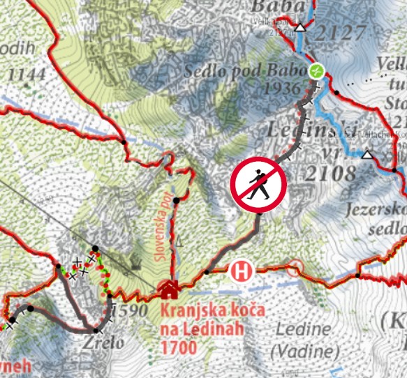 OPOZORILO: Uporabniki uporabljajo planinske poti na lastno odgovornost. Uporabniki planinskih poti morajo pri uporabi planinskih poti ravnati samoodgovorno in odgovorno do drugih tako, da ne ogrožajo ali poškoduje sebe ali drugega. Uporabnik je dolžan planinsko pot uporabljati tako, da se po njej ter na in ob zemljišču, preko katerega poteka in na drugih nepremičninah ter favni in flori ob njej ne dela škoda. Prepovedano je omejevati dostop na planinske poti ter poškodovati, odstranjevati ali uničevati markacije, usmerjevalne table, skrinjice in varovalno opremo in druge oznake ali uporabljati neoznačene bližnjice. |