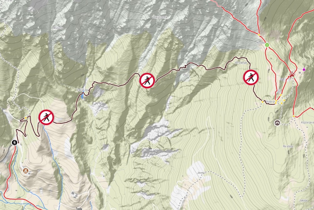 OPOZORILO: Uporabniki uporabljajo planinske poti na lastno odgovornost. Uporabniki planinskih poti morajo pri uporabi planinskih poti ravnati samoodgovorno in odgovorno do drugih tako, da ne ogrožajo ali poškoduje sebe ali drugega. Uporabnik je dolžan planinsko pot uporabljati tako, da se po njej ter na in ob zemljišču, preko katerega poteka in na drugih nepremičninah ter favni in flori ob njej ne dela škoda. Prepovedano je omejevati dostop na planinske poti ter poškodovati, odstranjevati ali uničevati markacije, usmerjevalne table, skrinjice in varovalno opremo in druge oznake ali uporabljati neoznačene bližnjice. |