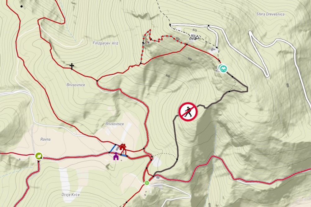 OPOZORILO: Uporabniki uporabljajo planinske poti na lastno odgovornost. Uporabniki planinskih poti morajo pri uporabi planinskih poti ravnati samoodgovorno in odgovorno do drugih tako, da ne ogrožajo ali poškoduje sebe ali drugega. Uporabnik je dolžan planinsko pot uporabljati tako, da se po njej ter na in ob zemljišču, preko katerega poteka in na drugih nepremičninah ter favni in flori ob njej ne dela škoda. Prepovedano je omejevati dostop na planinske poti ter poškodovati, odstranjevati ali uničevati markacije, usmerjevalne table, skrinjice in varovalno opremo in druge oznake ali uporabljati neoznačene bližnjice. |