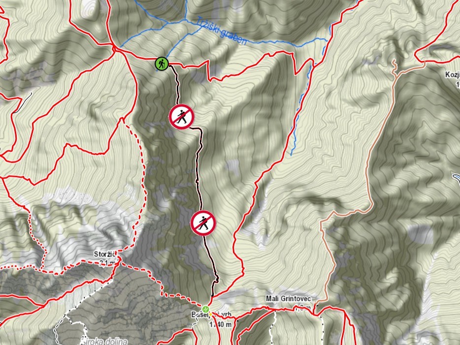 | OBVESTILO UPORABNIKOM PLANINSKIH POTI: Uporabnikom planinskih poti priporočamo, da se na spletni strani stanje-poti.pzs.si, v bližnji planinski koči ali pri lokalnem planinskem društvu predhodno informirajo o dejanskem stanju planinskih poti. Če opazite poškodbe planinskih poti ali njihovo neustrezno urejenost (obledele markacije, zaraščenost ipd.), prosimo, da na naslov poskodbe.poti@pzs.si pošljete sporočilo, v katerem navedite, na kateri planinski poti ste opazili pomanjkljivost in pomanjkljivost opišite ter če je možno, dodajte tudi fotografijo.